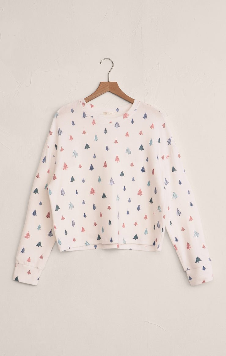 This brushed sweater knit brings a cozy feel with a touch of winter charm. Featuring a whimsical alpine tree print, this long-sleeve crewneck is ready for fireside lounging or festive weekends.