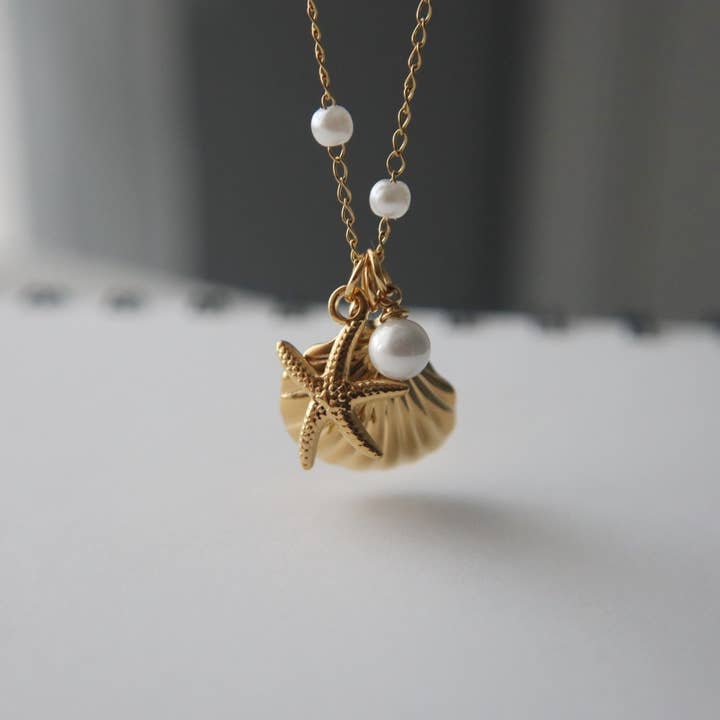 Feel the summer with our By the Shore Necklace. This pearl studded necklace comes with three charms - a dainty seashell, star, and a classic pearl. Perfect for adding a touch of seaside chic to any outfit! - stainless steel, gold plated - 16" in length with 2" extender