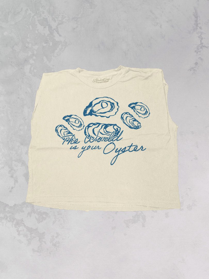 Get all of the ocean vibes in our oversized The World is Your Oyster, 90's style cropped tank!